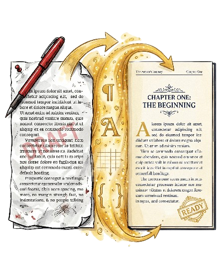 Most authors deliver their manuscript as a raw word processing document with inconsistent spacing, default fonts, and none of the typographic refinements that distinguish a professionally published book from a self-formatted one. Our manuscript formatting services take your raw text and transform it into a beautifully typeset interior that reads with the same visual quality and professional polish as any book you would find on the shelves of a major bookstore. From chapter openings and running headers to drop caps, scene breaks, and consistent paragraph styling, every element of your interior is crafted with the typographic expertise that professional publishing demands.